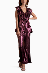 Elevate your style with this versatile top, featuring a touch of texture and a hint of glamour in glittery fabric. The front ruffle detailing adds a chic flair, while the flared pant with a front cut completes the look. Pair it with your favorite heels, and you're all set to slay any occasion with effortless style.