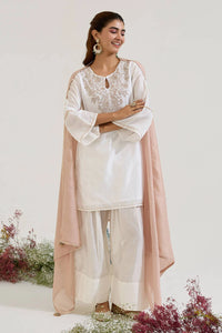 Fabric- Kurta and Pants- Chanderi, Dupatta- Chanderi Stripe Color- Kurta and Pants- White, Dupatta- Peach Embroidery- Kurta and Pants- Machine Embroidery , Dupatta- Machine Embroidery Fit- Relaxed Fit Size Worn by Model- S Model Height- 5'5 Components- 3 Product Code- SVENEROSTKS12&STD12