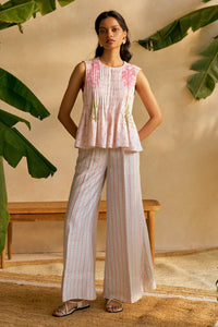 The Rouge Bliss Co-Ord Set is a statement of refined elegance and contemporary charm. Designed with attention to detail, this co-ord set captures the essence of luxury and effortless style, offering the perfect balance of timeless grace and modern flair. The Rouge Bliss Pintuck Top features intricate pintuck pleating that adds texture and depth to the fabric and the accompanying flared trousers offer a bold yet elegant contrast to the top. Their flowing, wide-leg design creates an elongated silhouette, while maintaining a sense of comfort and ease.
