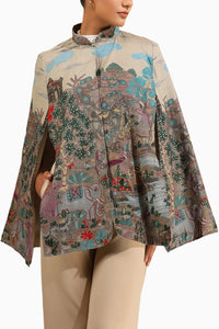 Introducing Roxane, a masterpiece of luxury and artistry, a Kalamkari cape meticulously crafted from the finest wool silk blend. Experience the perfect harmony of softness and elegance, adorned with intricate hand-painted designs that tell a story of timeless tradition. Versatile and exquisite, this cape enhances any outfit, embodying sophistication and cultural heritage on every occasion. Revel in the unmatched quality and style of Roxane, a true symbol of opulence and grace.