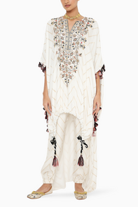 Featuring Off White Colour Embroidered Zig Zag Banarasi High Low Kaftan With Jogger Pant.