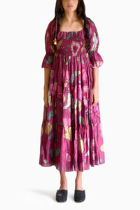 Rediscover Taro's quintessential style with our Ruby Berry tiered dress, tailored In luxurious chanderi silk with foliage print in wine red color. It has a square neck and statement sleeves. The smocked neckline & bodice is meticulous and precise, making it ideal for special occasions.Â