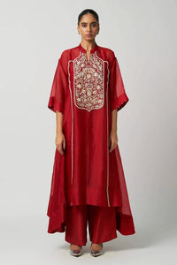Elevate your festive wardrobe with this pure organza hand embroidered flared kurta, crafted for elegance and comfort. Featuring a beautifully flowing A-line silhouette with generous flare, this piece drapes effortlessly on all body types, making it a forgiving and flattering fit. The kurta is adorned with delicate hand embroidery, adding timeless charm and artisanal detailing that stands out at any celebration.