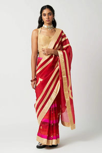 The Ruby Mehrabiya Saree is a distinguished Ohfab creation, crafted in a half-and-half composition that pairs the richness of handwoven pachranga silk with the ethereal grace of organza. The silk drape is intricately embellished with woven bootis, reflecting Ohfab’s hallmark craftsmanship, while the organza pallu showcases delicate tissue applique in Mughal arch motifs , an ode to architectural elegance. The interplay of vibrant ruby tones, texture, and heritage design makes this saree a statement of refined opulence, ideal for weddings, festive gatherings, and luxury celebrations.