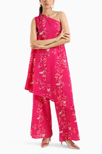Turn heads with this striking ruby pink one-shoulder kurta set, adorned with a delicate chidiya print that brings a playful and artistic charm to traditional wear. The asymmetric neckline adds a bold, modern edge, while the rich ruby pink hue lends a touch of elegance. Crafted in soft, breathable fabric, this ensemble blends effortless comfort with standout style—perfect for festive occasions, brunches, or a statement daytime look.