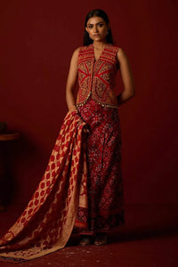Wrap yourself in tradition with this Ruby Red Banarasi Bandhani Dupatta, adorned with delicate tassels and luxurious golden finishes. Its rich texture and vibrant hues add a timeless, elegant touch to any ensemble.
