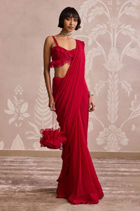 Bold and playful, the Ruby Saree Set features a voluminous organza ruffled blouse matched with a flowing georgette ruffled saree. Paired with a crepe petticoat, this set brings drama and movement- ideal for making a statement at festive or evening events.