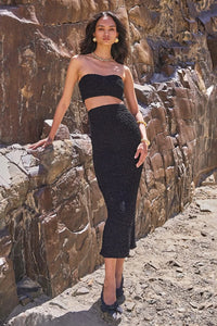 Black bodycon bralette with all-over textural ruching. Adjustable spaghetti straps for a customizable fit. Garment is fully lined. Paired with matching straight skirt with all-over textural ruching. Skirt has zipper with hook and eye closure at the back. Slit at the center back.