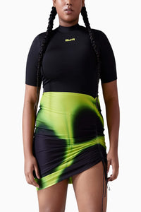 Introducing our captivating Ruched Tee Neon mini dress, where contemporary meets charm. Featuring short sleeves and a classic crewneck collar, its body-hugging silhouette is accentuated by an attached ruched skirt with adjustable drawstrings for a personalized fit. Complete with a concealed zip closure at the back and adorned with the Cilvr signature metal monogram, each piece is unique due to its distinctive print, ensuring a one-of-a-kind allure.