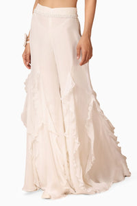 Introducing Shriya Som's ruffle pants from the Chrysalis Collection, crafted in a light chiffon base and featuring elegant ruffles in a graceful godet pattern, offering a flowing, sophisticated silhouette.