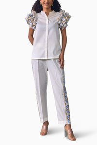 This season's must-have ensemble is the slay play co-ord, featuring exaggerated crochet ruffles adorning the shoulders for a touch of glamour. The ensemble boasts a chic ban collar and front button opening, exuding effortless sophistication. Paired with slim-fit pants accented with crochet detailing and completed with strappy white high heels, this outfit is guaranteed to turn heads wherever you go.