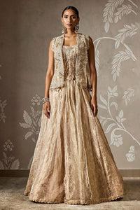 The Ruhani Lehenga Set epitomizes elegant restraint, featuring a finely embroidered tissue blouse and a sleek plain tissue lehenga. Complemented by a delicately embroidered sleeveless tissue jacket, this ensemble melds ethereal textures with timeless artistry, crafting a sublime silhouette for the discerning connoisseur of contemporary couture.