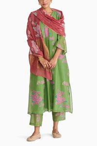 Introducing the Handwoven Chanderi Kurta in a serene pista green color, adorned with intricate Bougainvillea floral block prints for a touch of elegance. This kurta is paired with a handwoven chanderi dupatta featuring delicate zari block prints in vibrant pink, adding a stunning contrast and refined detail. Complementing the look, the ensemble includes comfortable cotton trousers, creating a harmonious and stylish outfit perfect for any special occasion.