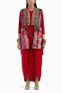 A chic and contemporary ensemble featuring a yoke-embroidered classic open jacket paired with a relaxed-fit short solid kurti with printed inserts. The outfit is complemented by draped trousers, combining comfort and style. The look also includes an open, structured sleeveless jacket and an easy-fit kurta with an elasticated waistband, offering a relaxed yet elegant silhouette. Perfect for a blend of modern sophistication and traditional charm.