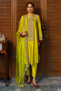 Featuring the Ruksaan olive green mukaish silkmul embroidered yoke kurta paired with matching pants and an embroidered organza dupatta, this elegant set offers a relaxed fit with detailed craftsmanship. Perfect for festive occasions, it combines rich color with intricate embroidery for a refined look.