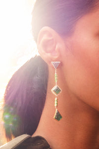 The Essence-This dainty yet statement pair of danglers is made of Morning Star and Regal Moss stones, interspersed with intricate enamel work.