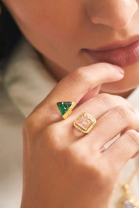 The Essence-This in-between finger ring made with Morning Star, Vintage Blush, and Regal Moss stones evokes a sense of old-world charm.