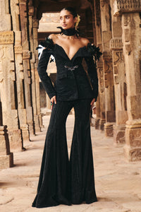 Black blazer and flared pants made of crystal fabric and feathering details on the neckline The blazer has a corset attached for support and showcases our brand logo in the centre.