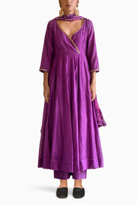 Our Russian Violet Anarkali kurta is crafted in chanderi silk, adorned with beads and sequins hand embroidery in the front and on sleeves. It has three-quarter sleeves and an overlapped bodice making a sweetheart neck in the front. It is paired with matching solid straight pants and foliage printed chiffon dupatta featuring cut work all over the border and sequin hand work on it.