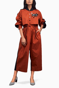 Featuring Rust and Black Utility Jumpsuit with Badges by Deepika Arora. Make a bold statement with the Rust and Black Utility Jumpsuit with Badges, a perfect fusion of style, comfort, and practicality. Crafted from premium cotton, this jumpsuit offers an effortlessly chic fit that its breathable and perfect for all-day wear. The rich rust hue paired with sleek black accents creates a striking, modern contrast that its both eye-catching and versatile.