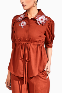 This shirt is designed with puffed half sleeves, a front button opening for easy wear, and a drawstring at the waist for a flattering fit. It is adorned with beautifully embroidered floral sequin patches, adding a touch of elegance and charm to the overall look. Perfect for adding a stylish and feminine touch to your outfit.