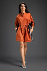 This rust shirt romper combines utility style with a modern twist, featuring black detailing and metallic side panels for a bold contrast. The drawstring waist offers a customizable fit, enhancing comfort and shape. With its relaxed silhouette and statement accents, itsperfect for casual days with an elevated edge.