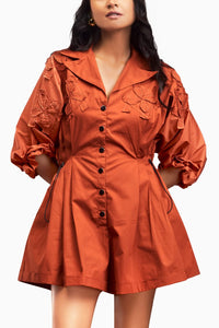 Featuring Rust Lapel Collared Pleated Playsuit by Deepika Arora. Embrace effortless style with the Rust Lapel Collared Pleated Playsuit, a perfect blend of sophistication and comfort. Crafted from soft, breathable cotton, this playsuit offers all-day comfort while exuding chic, modern appeal. The rich rust hue adds warmth and depth to your wardrobe, while the lapel collar and pleated design bring an elegant, tailored finish to this playful piece.