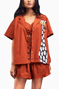 Featuring Rust Oversized Cuban Collared Shirt Co-Ord Set with Patchwork Detailing by Deepika Arora. This chic co-ord set, made from soft cotton, features an oversized Cuban collared shirt with unique patchwork detailing and matching shorts. Perfect for a relaxed yet fashion-forward look, adding a touch of warmth and style to your wardrobe.