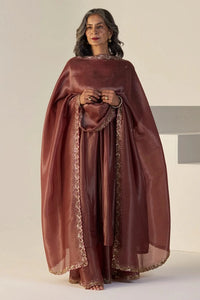 Featuring the Rust Rehmat Lehenga Set, a hand-embroidered, relaxed-fit ensemble tailored in tissue silk. Complete with a matching dupatta included, this set exudes grace and festive elegance.