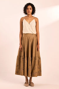 A skirt with delicate block prints in oxford cotton. Ladder lace detailing above the hem and soft gathers flowing below for a vintage charm. Finished with side seam pockets for effortless functionality.