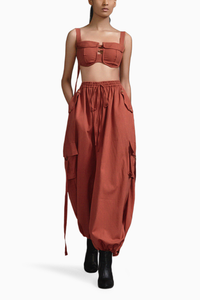 A set of well-fitted pocket corset with adjustable straps and elastic back with Baggy-fit cargo pants with side pockets and elastic back.