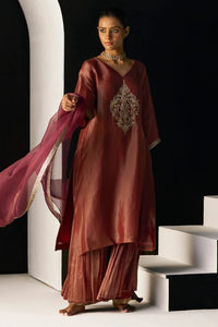 Featuring the Rust Sana Suit,  a hand-embroidered ensemble with a kurta and pants tailored in tissue silk, paired with an organza silk dupatta. The dupatta is included with the set, completing this elegant and timeless look.