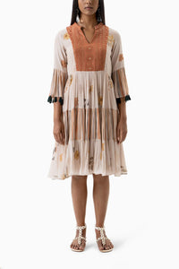 Featuring a doodle printed rust stripes tier dress with thread and sequin work.