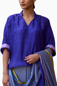 Featuring Rustling Whispers Purple Blouse is crafted in handwoven mulberry silk. This loose-fit, collared purple blouse features a contrasting color lining detail on the sleeve.