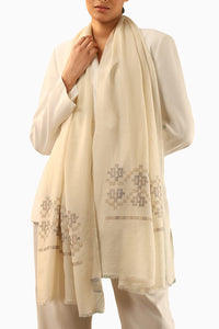 The Saavi stole features premium stone work in white Cashmere Fine Wool. This piece combines traditional craftsmanship with contemporary style for a refined look.