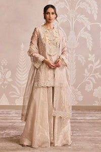 Light and elegant, the Saba Kurta Set combines an all-over embroidered tissue kurta with a plain tissue sharara. The small-width tissue dupatta with two-sided embroidery adds a refined touch- ideal for daytime events or subtle celebrations with an understated charm.