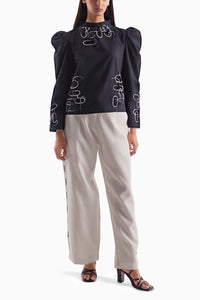 A sophisticated two-piece ensemble featuring a black upper with exquisite hand-done circle embroidery and refined white pants accented with subtle black and grey detailing. Crafted from premium materials, this luxurious set effortlessly combines modern artistry with timeless style, perfect for any upscale occasion.