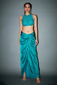 Featuring the Sabrinna Blue Co-ord Set by ITRH's Diwali Jaaneman Collection, this stunning ensemble features an emerald green crystal-embellished halter top, paired with a satin draped skirt and cape, blending elegance and modern flair for a show-stopping look.