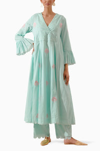 Featuring Sadabahar Kurta Set by Label Earthern from their Band Phool Collection. This aqua green cotton mal kurta set showcases intricate resham embroidery with mirror detailing, offering a fresh and elegant look.