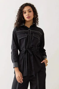 The Safa Black Shirt offers a chic blend of contemporary details and classic tailoring. Featuring a double-layered yoke both at the front and back, this shirt incorporates a structured collar and front black buttons for a polished finish. Pocket detailing adds subtle utility, while the topstitching along the yoke and sleeve seams emphasizes the precision of the design. The gathered waist, complemented by a tie-up feature, creates a flattering shape, and the full sleeves are finished with check topstitch accents for a unique, refined touch.