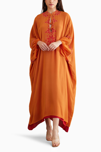 Featuring Saffron Applique Embroidered Kaftan Dress by Nikasha from Garden Of Eden Collection. Crafted in 100% Viscose georgette with applique embroideries highlighted with beads on the yoke and hand made tassels detailing.