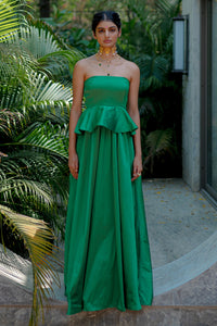A bold yet refined strapless silhouette in a vivid green, the Sage dress stands out with its structured peplum detail and dramatic flow. The flattering bodice cinches the waist while the flared skirt adds volume and movement, it's made for moments that call for grace and power.