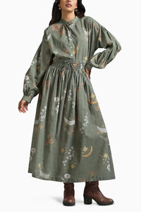 This is a set of two that comes with a shirt in a relaxed silhouette which is paired with a gathered midi skirt. The shirt features a mandarin collar with tiny gathered detail that's not to be missed! The skirt has an elasticated smocking on the waist with a tie-up.