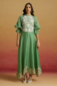 Featuring Sage Green Contrast Flounce Dress by Chandrima’s Amaryllis FW25 Collection. Crafted in sage green silk organza, this flounce dress features contrast cordwork, beadwork, and cutwork detailing, creating a dramatic, contemporary silhouette with artisanal elegance.