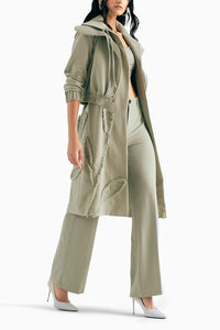 The Sage Green Floral Appliqué Bomber Trench, crafted from luxurious rayon crepe in a soft sage green, features intricate floral appliqué detailing. This modern piece blends the casual appeal of a bomber with the elegance of a trench, offering a chic and stylish look.
