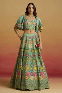 Featuring Sage Green Multicolour Floral Bustier with Lehenga by Chandrima’s Amaryllis FW25 Collection. A graceful sage green chanderi ensemble featuring a multicolour floral-threaded, bead-embellished bustier with organza-detail sleeves, paired with a matching lehenga adorned with intricate threadwork and bead embellishments for modern artisanal elegance.