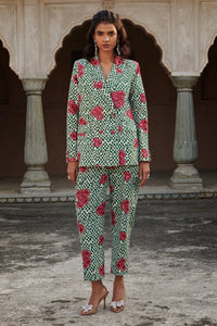 Step into bold sophistication with oversized pant suit. Featuring a double breasted blazer, adorned with exquisite hand embroidery on blazer. Designed for comfort, the oversized fit and padded shoulder offers a modern silhouette. Paired with hand embroidered straight fit pants featuring half elasticated belt and side inseam pockets.