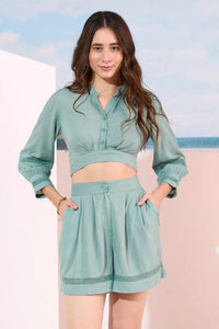 Breezy and effortlessly chic, Sage Green Shorts Set is perfect for sun-soaked days and relaxed outings. The cropped blouse features a button-down front with delicate pleats, while the matching high-waisted shorts offer a comfortable fit with subtle lace trim detailing. Complete the outfit with strappy sandals and minimal jewellery for an elegant yet laid-back vibe.