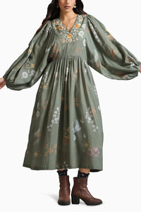 The dress is crafted out of cotton mul and comes in an anti-fit silhouette. It has an elasticated back waist that adds a feminine touch to the style and some extra comfort. The hand painted artworks are digitally placed all over the dress. The yoke features hand embroidery.