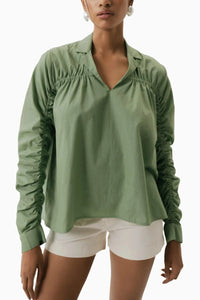 Featuring the Sage Ripple Shirt by OSHIN's SS'25 collection. This relaxed-fit shirt boasts a notched collar, shoulder-to-arm ruching detail, regular cuffs, and a stylish high-to-low hem—perfect for a chic, effortless look.
